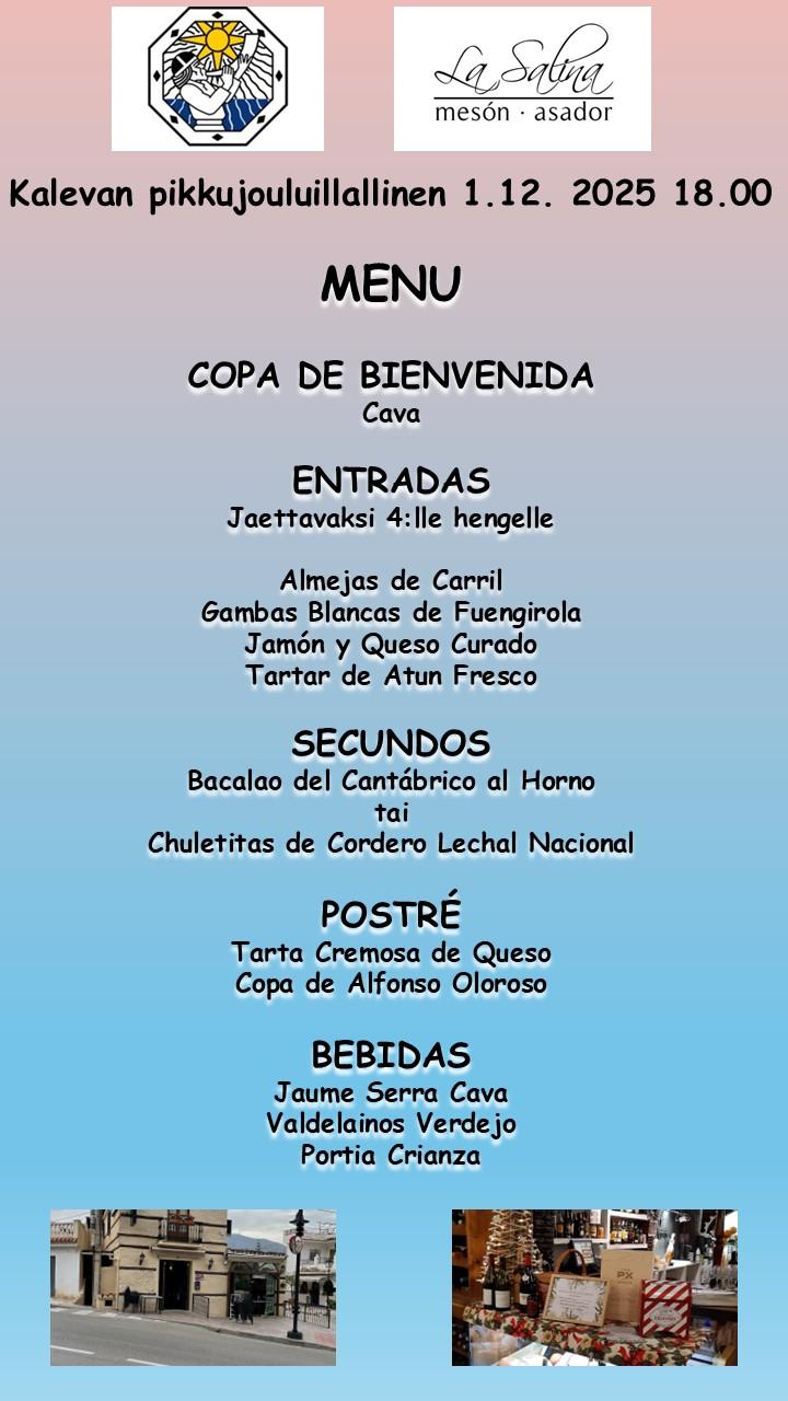 Kalevan pikkujoulu illallinen ma 1.12.2025 klo 18.00 Meson Las Salinas'ssa
